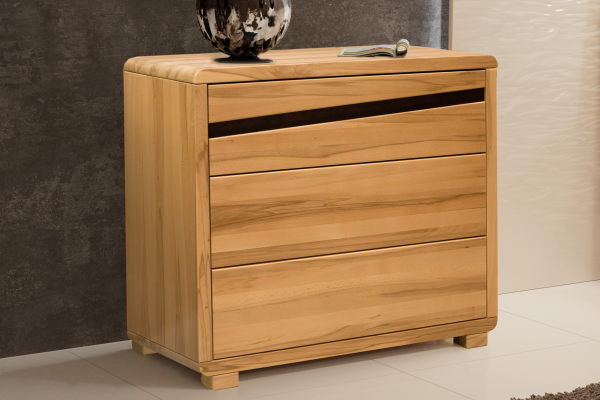 Komoda Angela tvoří jedinečný zakulacený vzhled a díky zapuštěným zásuvkám bez úchytek s push-on otvíracím systémem, působí čistým vzhledem. Je zde možnost zapuštěného pruhu v horní části komody, aby designem zapadala k posteli Amelia. (prosíme napsat do poznámky č. moření pruhu). Rám komody je celý ze 4cm masivu.
