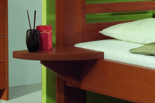 Viola –Další stolek ze série zavěšených stolků. Tento jednoduchý, avšak elegantní stolek je plně zavěšen na bočnici postele.K objednání potřebujeme znát tloušťku bočnice postele a při pozdějším doobjednání i model postele. Čtyři centimetry silný čtvrtkruh má rozměr 40 x 40 cm. Vyrábí se z čistého buku i dubu, kde má plátek tloušťku 3 cm.