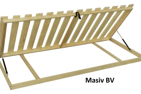 Pevný laťový rošt s bočním BV nebo předním NV výklopem. Výklopný rošt z masivních smrkových latí. Rám roštu je vyroben z vrstveného (větší pevnost) březového dřeva. Tento rošt je předurčen do postelí s úložným prostorem. Mnozí zákazníci tento typ roštu ocení i ve standardní posteli a to z důvodu velmi jednoduchého úklidu pod postelí. Je zde možnost materiál BUK pro větší pevnost a nostnost roštu (ve výběru vyberte Masiv BV-BUK nebo Masiv NV-BUK)